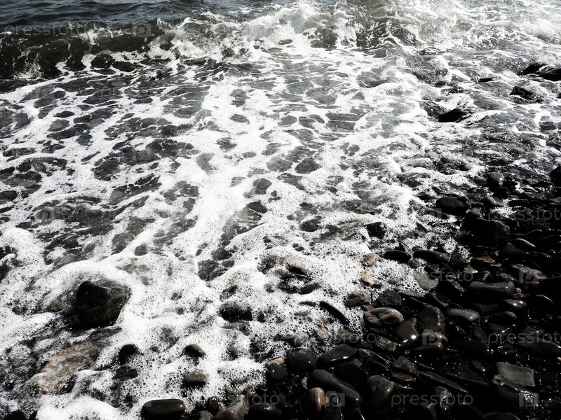 Морской каменистый пляж с волнами Сукко, Анапа, Краснодарский край, Россия. Морская пена на галечном пляже сверху. Крупные округлые гальки и валуны в воде. Горизонтальное фото Черное море, Кавказ