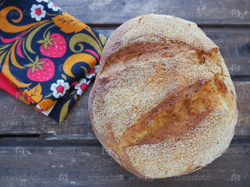 Круглый хлеб вид сверху. Вкусный свежий кукурузный хлеб с брызгами на старом деревянном столе и красивое традиционное полотенце. Скопируйте пространство. Традиционные рецепты. Хлеб ручной работы