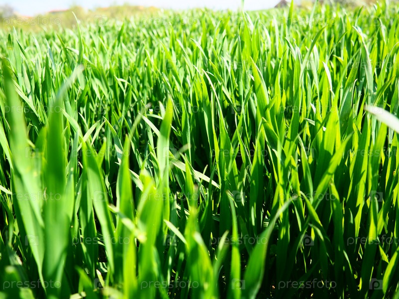 Красивая сочная зеленая трава на лугу или в поле. Озимая пшеница выросла на сельхозугодьях. Солнечная погода. Поле, поляна или луг с дикой растительностью. Естественный фон