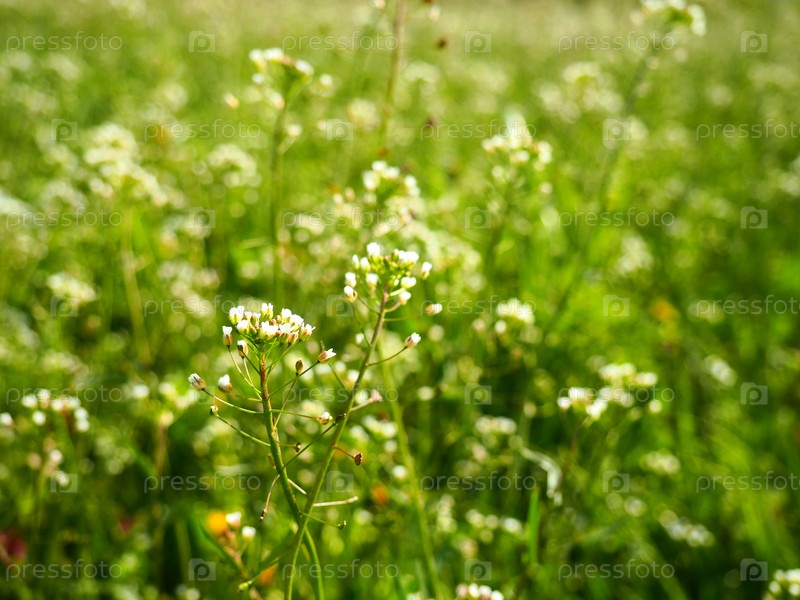 Растение пастушьей сумки на лугу. Capsella bursa-pastoris. Луга или поле. Лесная лужайка в лесу. Цветящие полевые травы. Цветущая дикая луга или пастбище. Свежая зеленая трава весной. Белые цветы