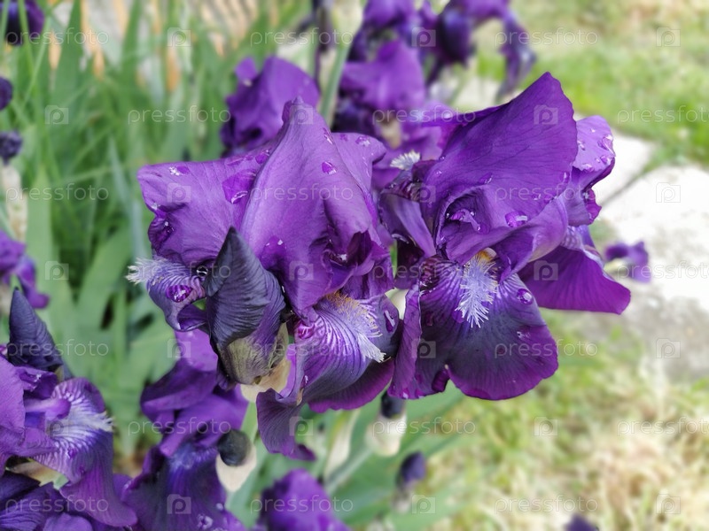 Фиолетовые ирисы. Красивые нежные цветы темно-сине-фиолетового ириса в саду. Изящные лепестки. Мягкий фокус. Размытое изображение