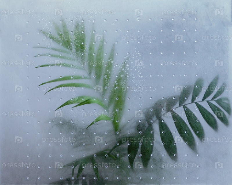 Пальмовые листья за замерзшим стеклом