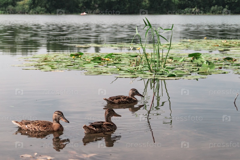 Пруд с водяной лилией с утками, летний загородный пейзаж