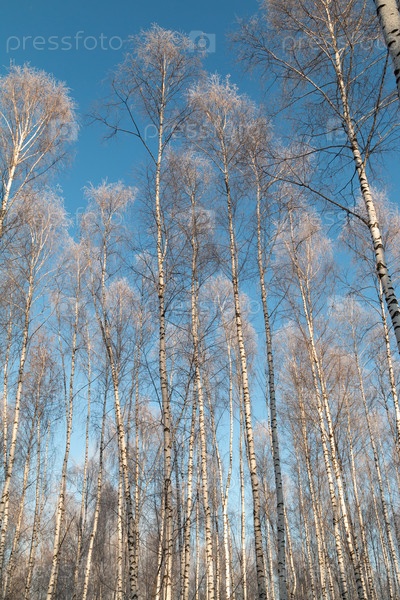 Снежные деревья на фоне голубого неба, солнечная и холодная зимняя погода
