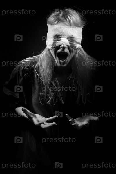 Испуганная кровавая блондинка кричит на черном фоне, монохромный