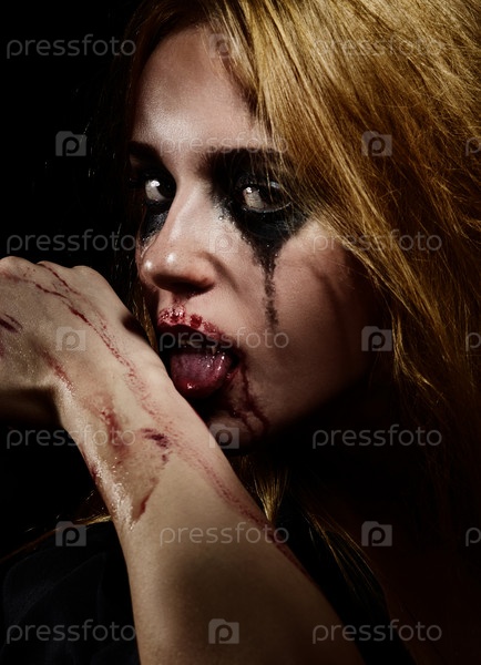Сумасшедшая кровавая девушка с размазанной косметикой, лижущая кровь
