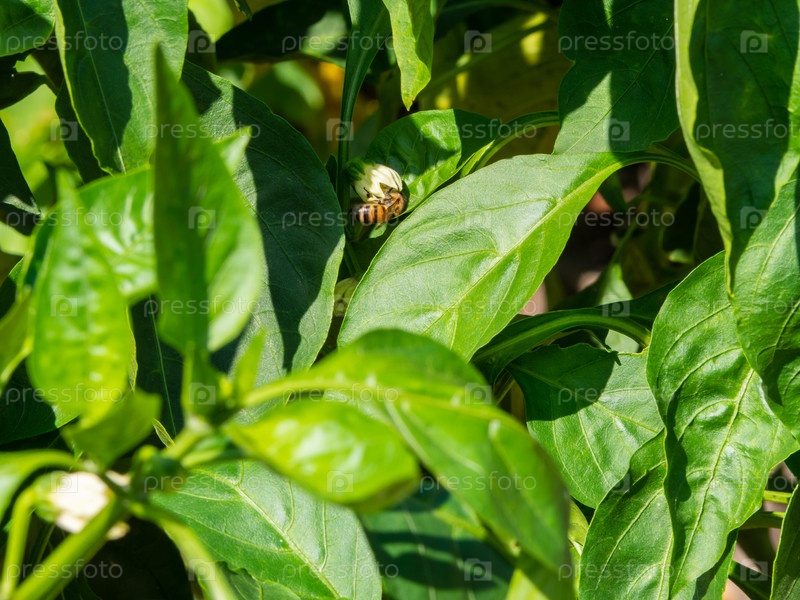 Пчела опыляет цветок перца. Зеленый фон из листьев овощного перца. Крупный план зеленых листьев растений, освещенных солнцем. фон зеленых листьев чили. Молодые зеленые растения перца