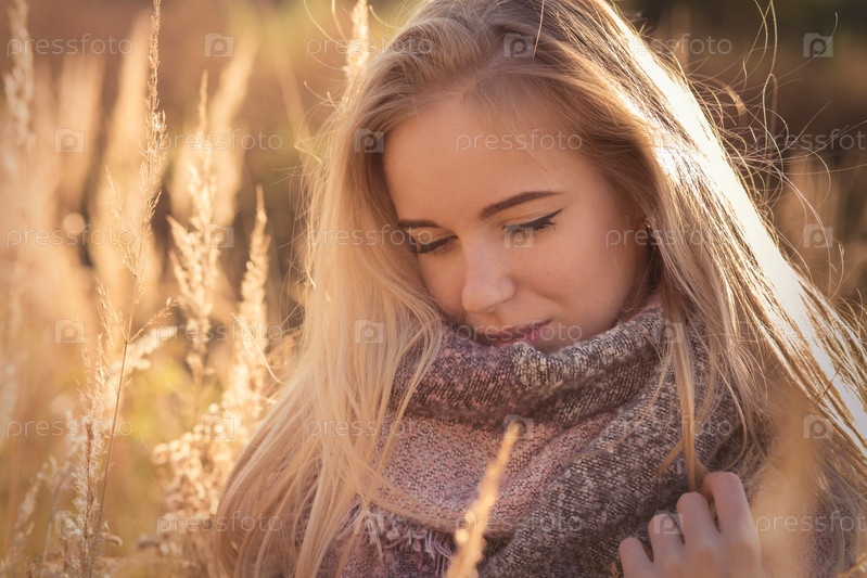 Грустная красивая женщина в сухой траве на закате, тонированное изображение