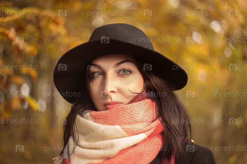 Серьезная женщина в черной шляпе на желтом размытом фоне