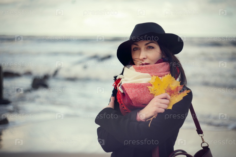 Грустная задумчивая женщина обняла себя на фоне моря