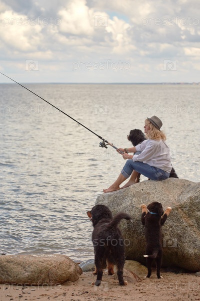 Женщина-рыбак сидит