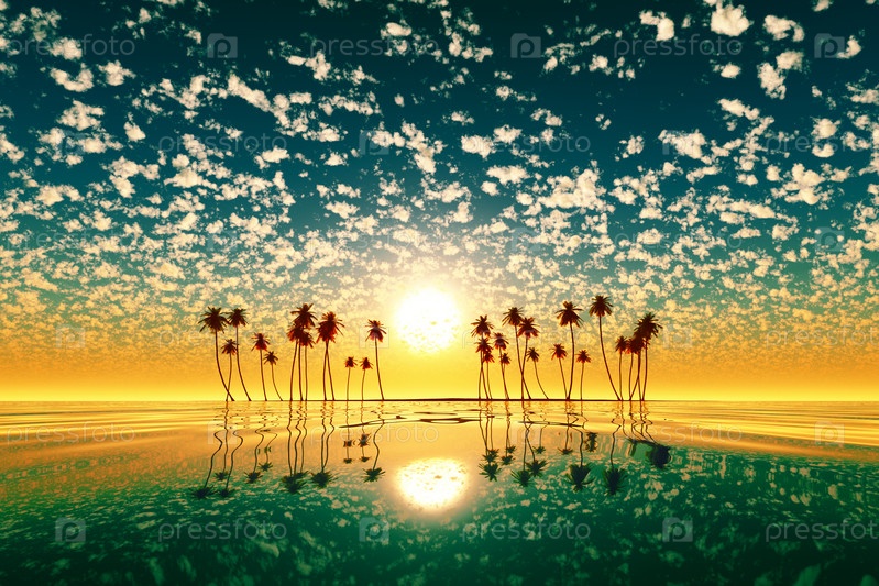 Золотой закат над тропическим островом зеленый