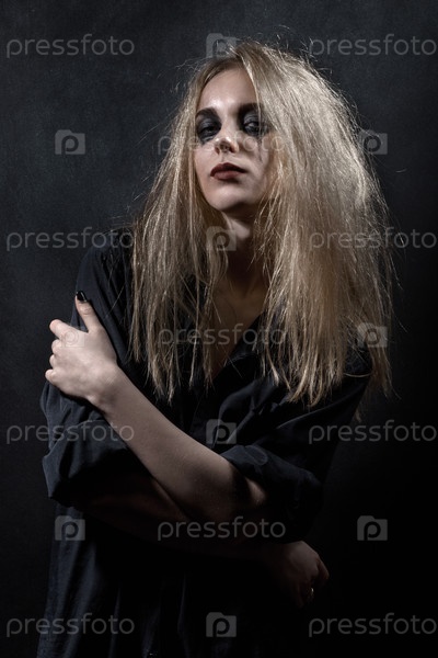 Красивая ведьма с пушистыми волосами и размазанной косметикой на черном фоне