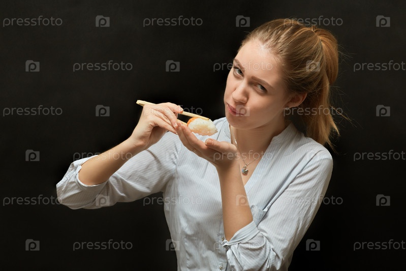 Девушка ест суши