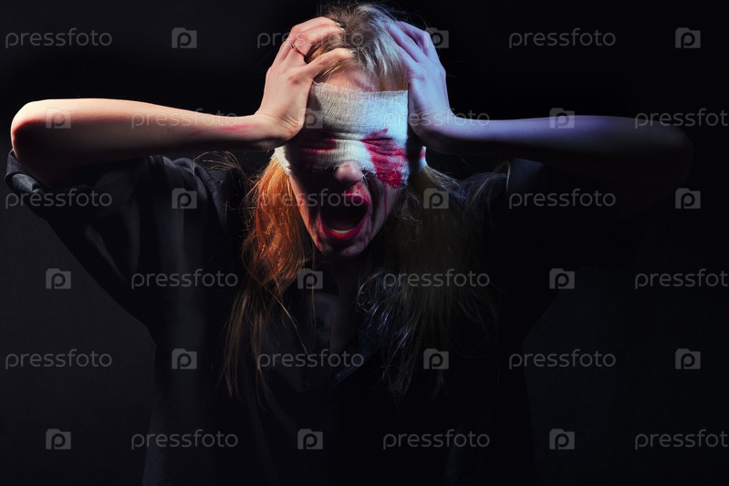 Испуганная кровавая девушка кричит на черном фоне с копирайтом