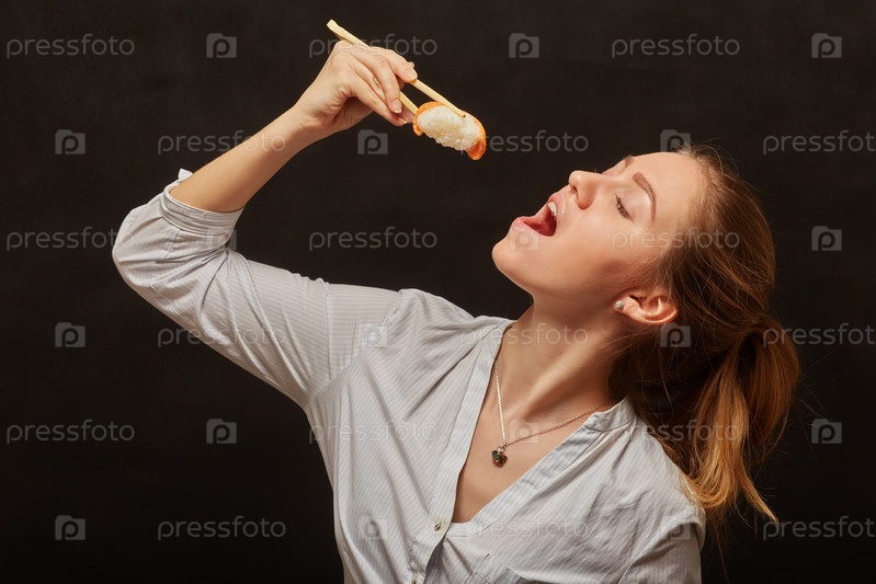 Девушка ест суши