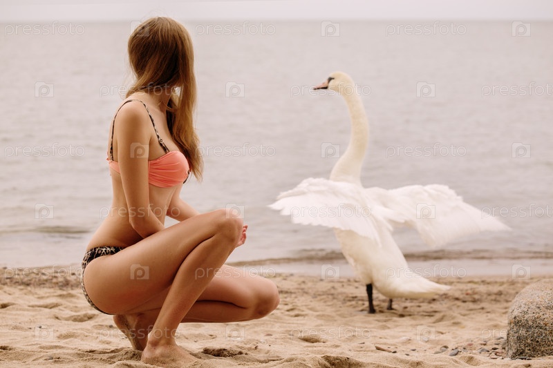Женщина с лебедем на морском пляже, тонированное изображение