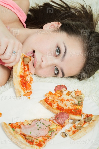 Грустные переедающие девушки лежащие едят кусочки пиццы, глядя в камеру