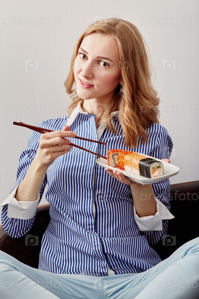 Женщина ест суши