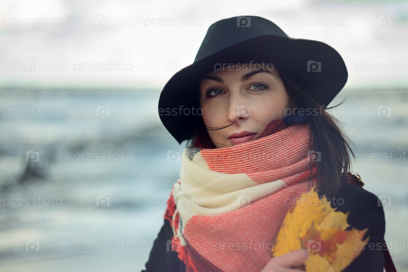 Грустная женщина в черной шляпе на фоне размытого моря