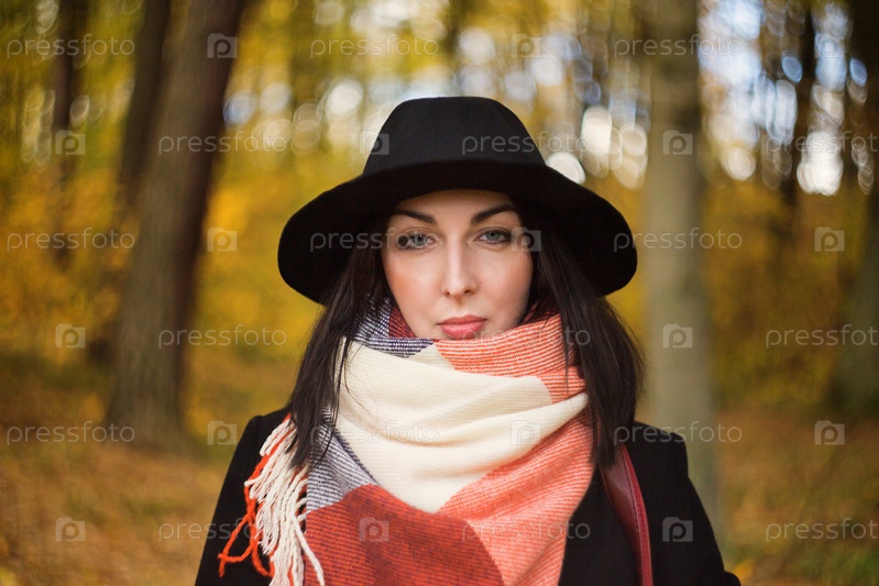 Серьезная женщина в черной шляпе на желтом размытом фоне
