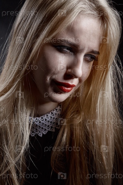 Грустная девушка плачет на черном фоне