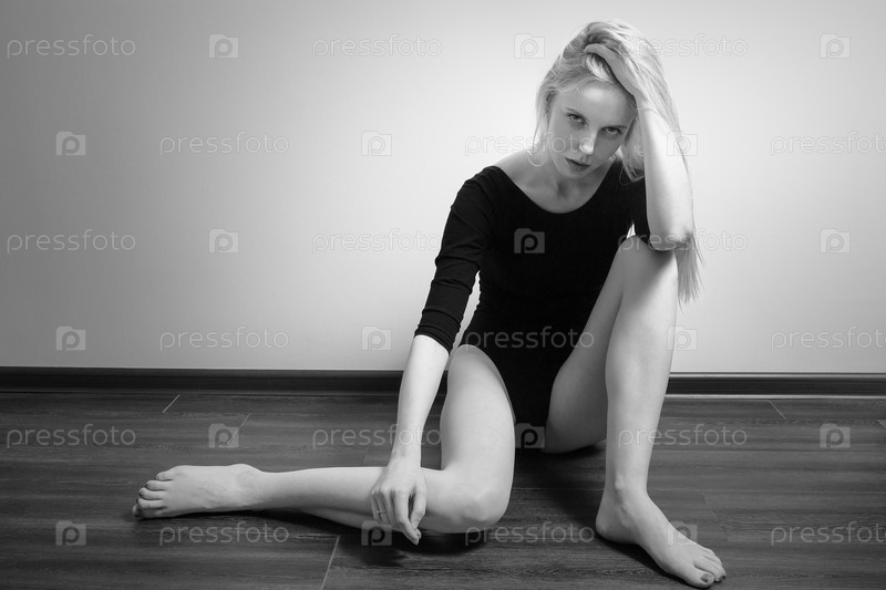 Грустная девушка сидит на деревянном полу, монохромный