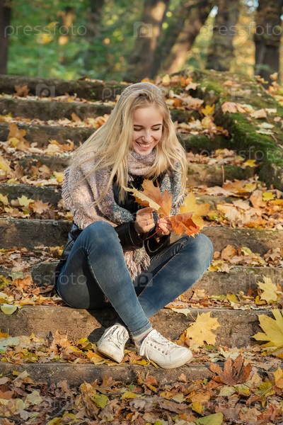 Счастливая девушка в осеннем парке улыбается тонированное изображение