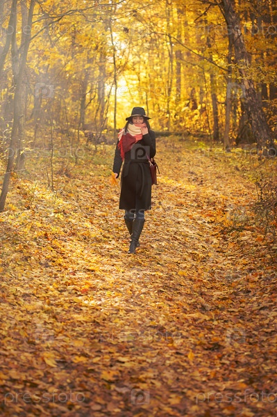 Красивая молодая женщина гуляет в осеннем лесу