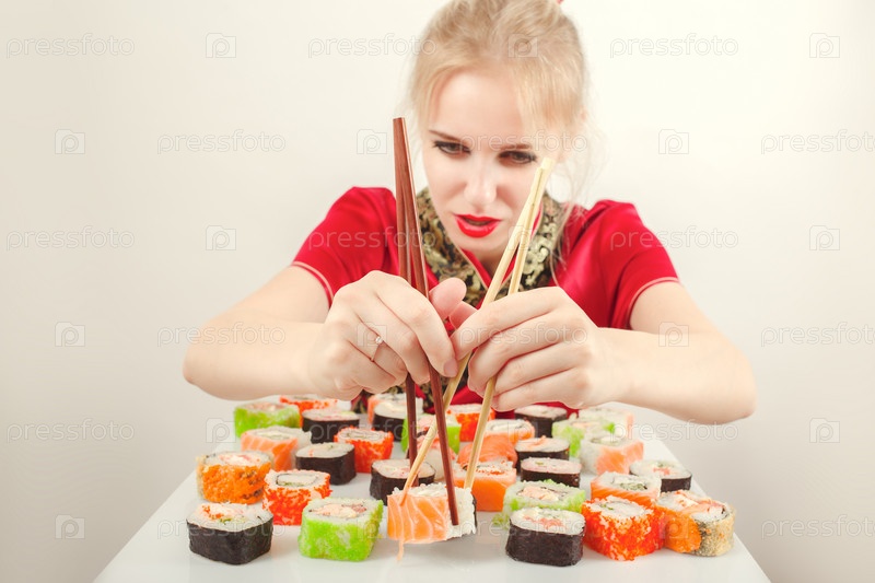 Веселая девушка с суши на белом фоне, тонированное изображение