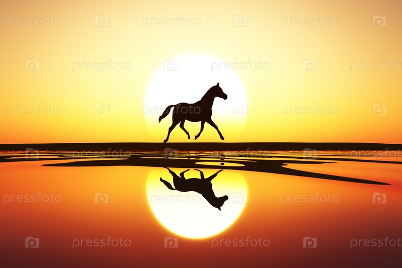 Силуэт лошадиной прогулки на закате моря