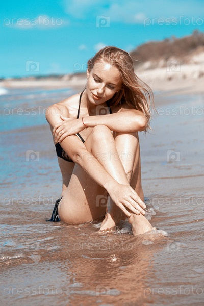 Блондинка в купальнике сидит на морском пляже и загорает