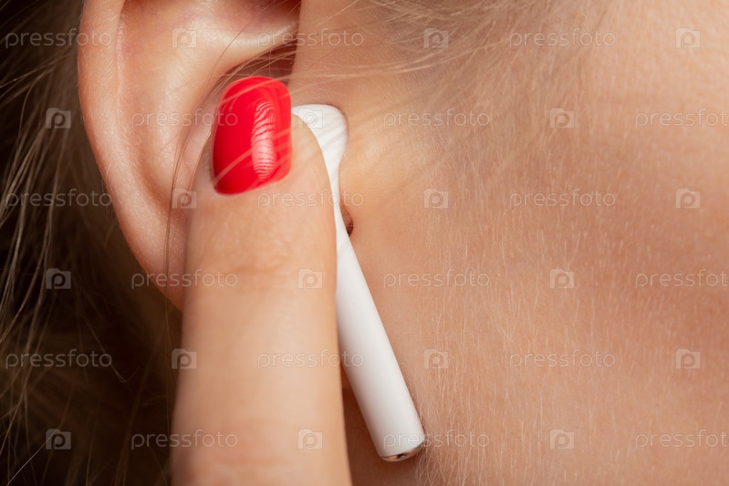 Женское ухо с пальцем, касающимся беспроводных наушников, вид крупным планом
