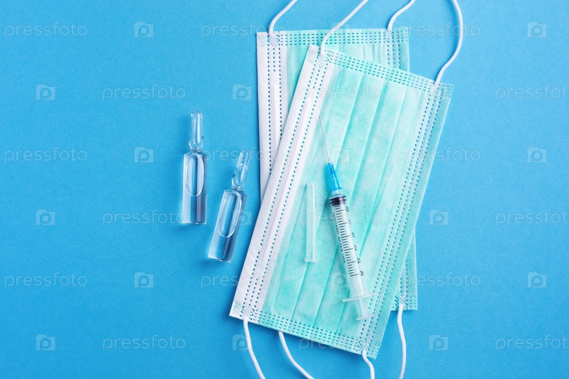 Медицинский фон с лекарствами во флаконах, шприцем и защитными масками для лица, изолированными на голубом. Концепция здравоохранения, вакцинации, лечения