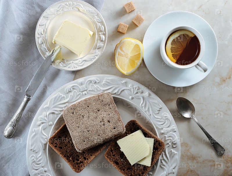 Простой завтрак - чай с лимоном и ржаной хлеб с маслом