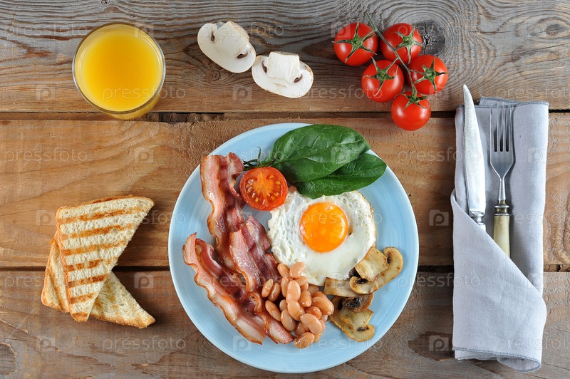Завтрак из яиц с беконом, фасолью, грибами, помидорами и шпинатом