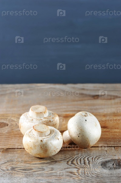 Свежие белые грибы шампиньоны на деревенском деревянном фоне