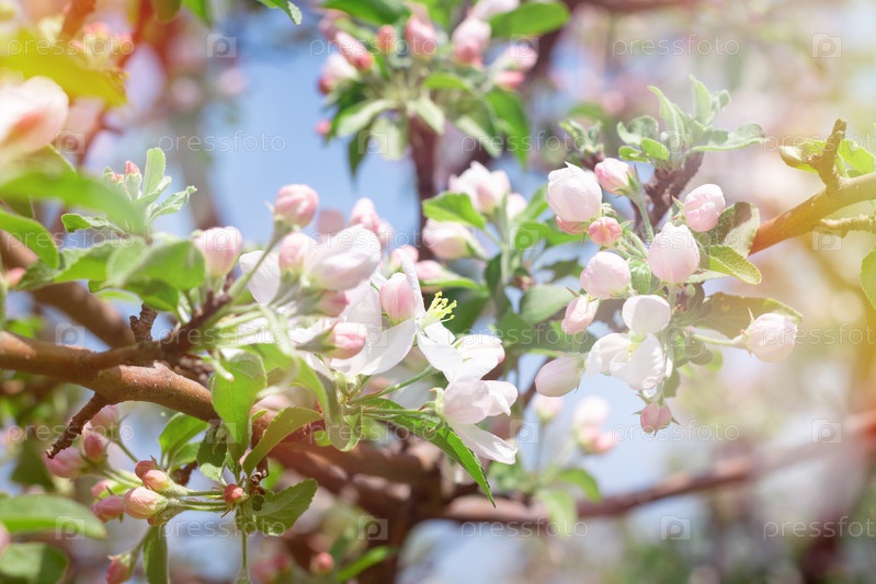 Цветущее дерево весной с цветами, природа фон с солнечным светом боке