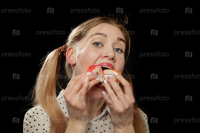 Женщина ест суши