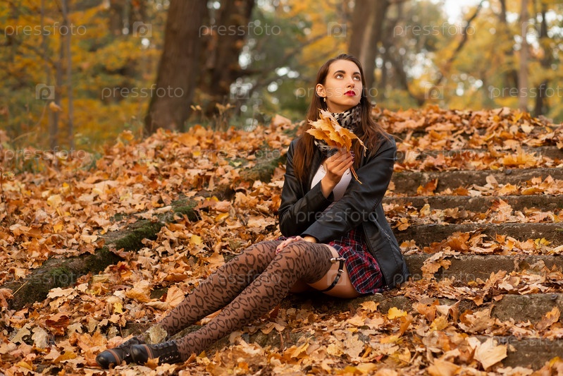 Грустная девушка в осеннем парке с кленовыми листьями сидит