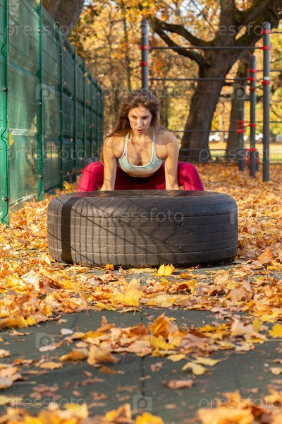 Женщина поднимает шину