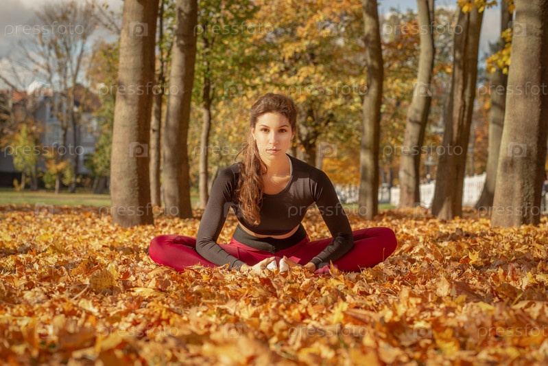 Стройная спортивная женщина растягивается в осеннем городском парке