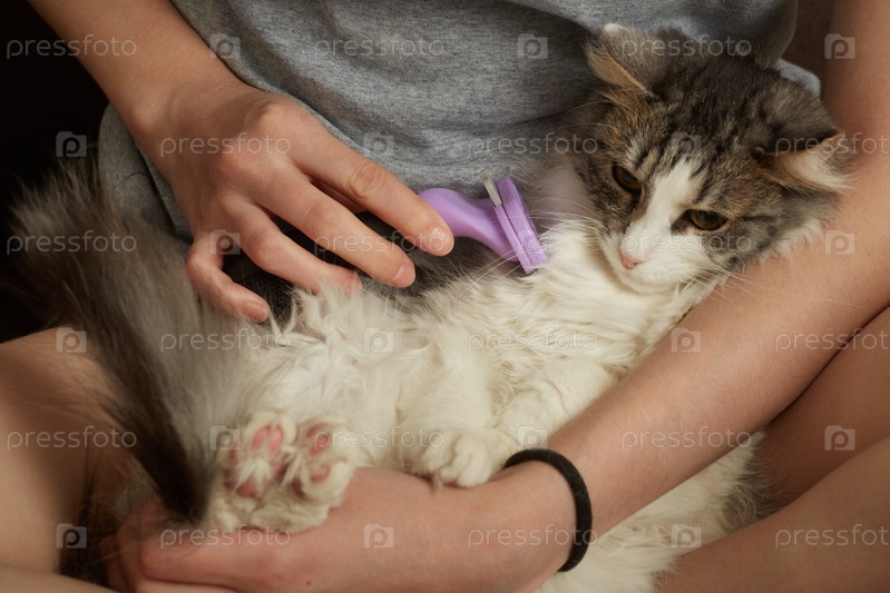 Женщина ухаживает за кошкой