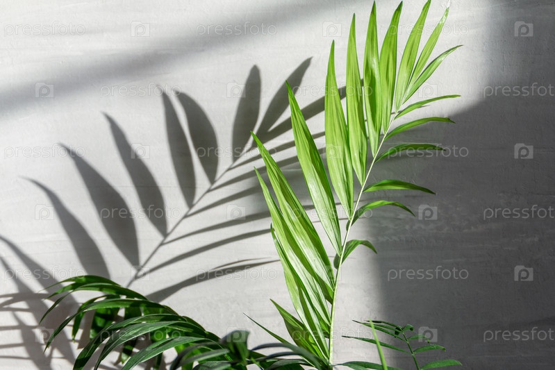 Пальмовый лист на сером текстурированном фоне с глубокой длинной тенью и естественным солнечным светом