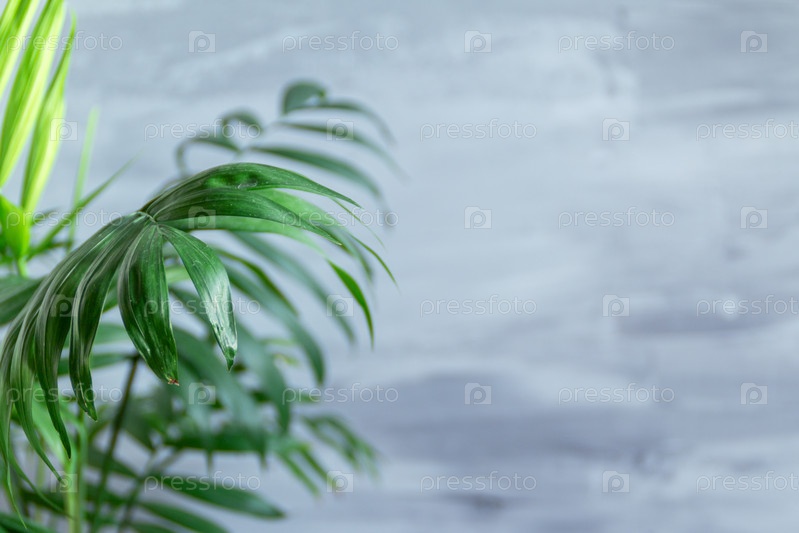 Пальмовый лист на сером текстурированном фоне с естественным солнечным светом