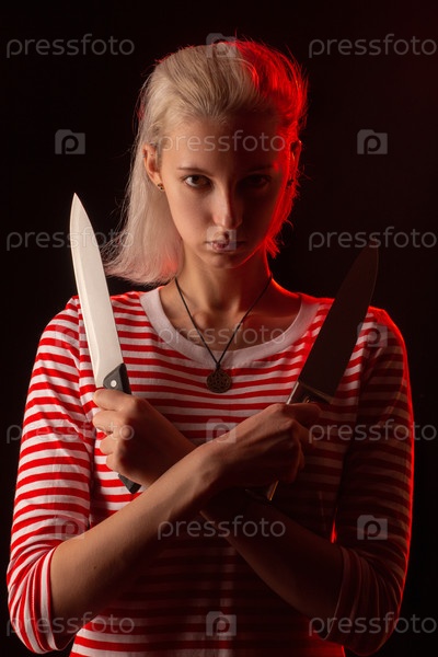 Серьезная молодая женщина с белыми волосами и ножами на черном фоне смотрит в камеру