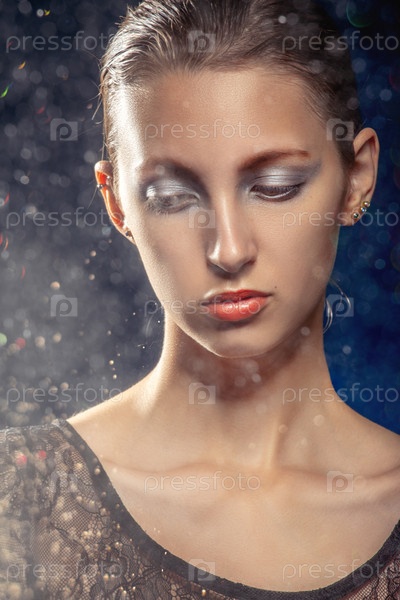 Серьезная красивая молодая женщина на синем фоне с эффектом боке смотрит вниз