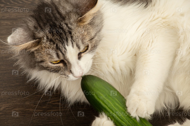 Кошка ест огурец