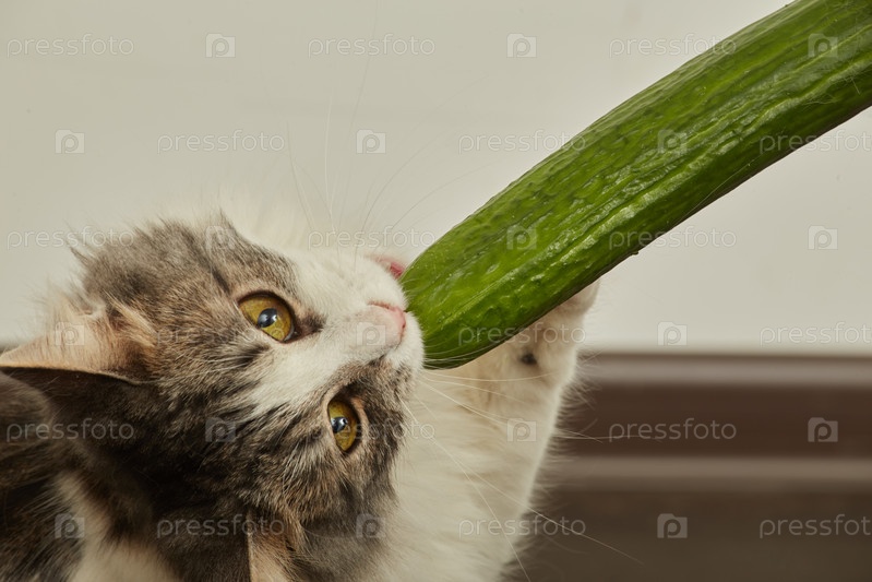 Кошка ест огурец