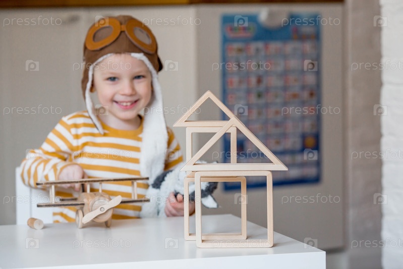 Маленький мальчик 3-х лет в пилотской шапке играет в деревянный самолетик и развивающий логистический конструктор. Детские деревянные игрушки для развития ребенка